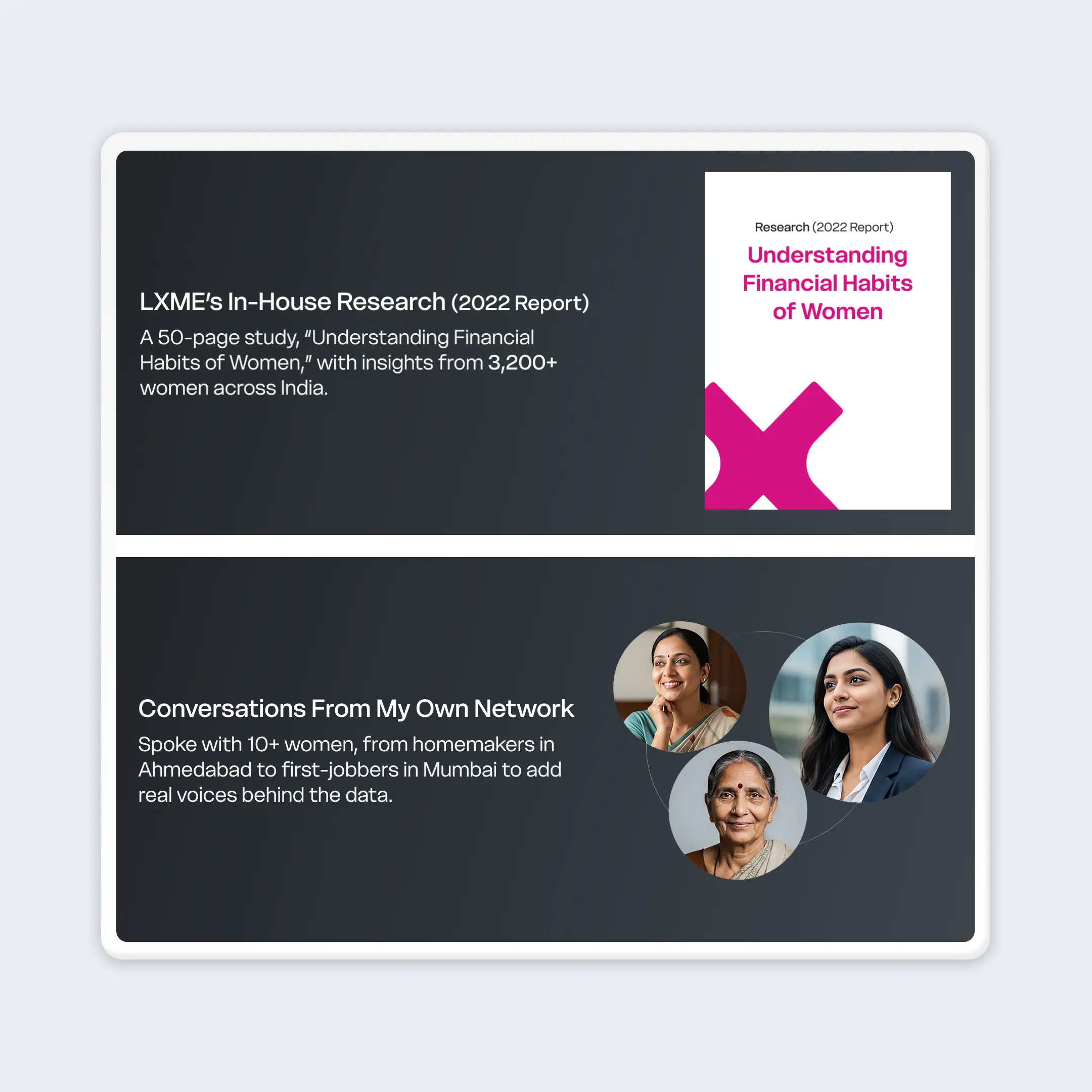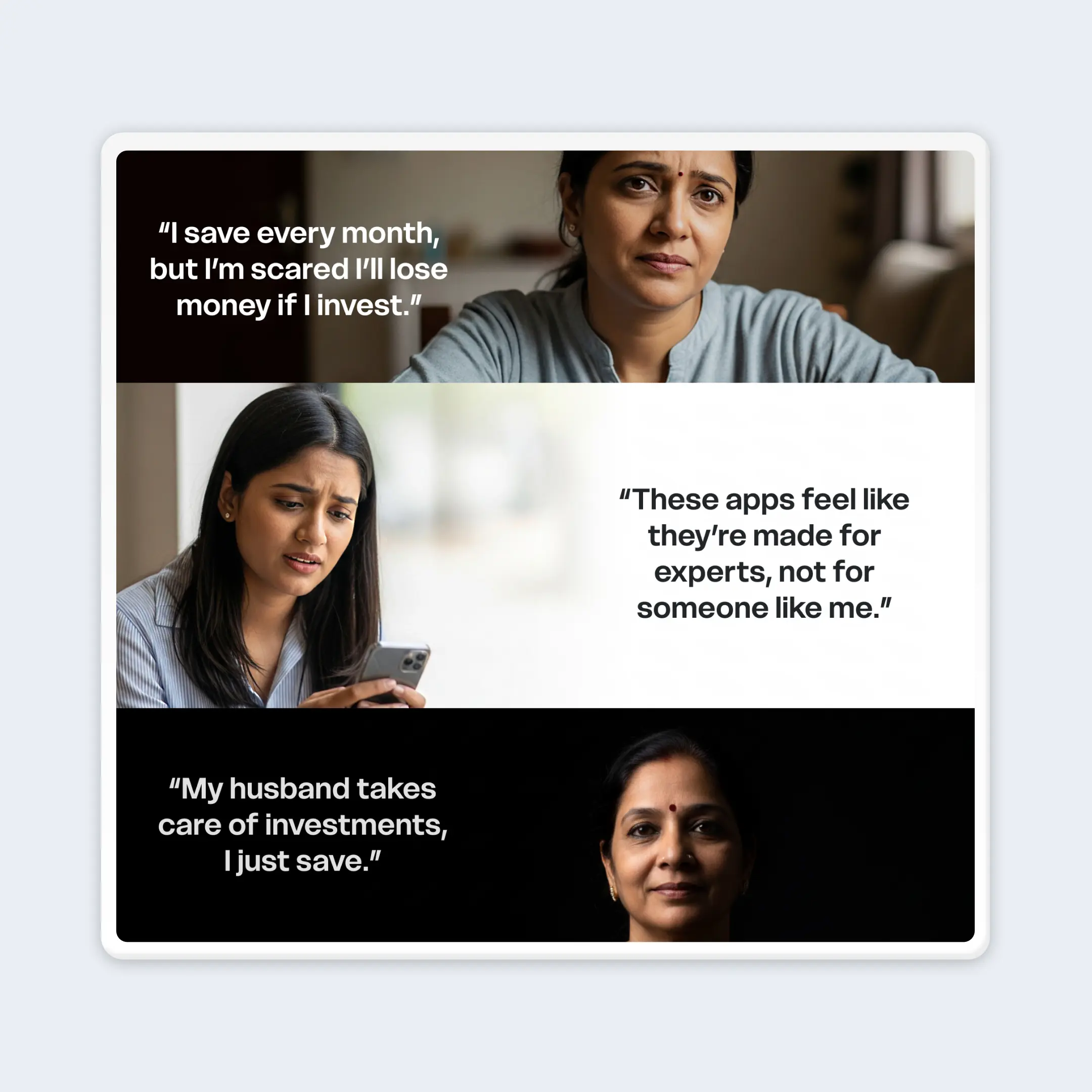 Most women in India were already saving money but avoided investing. Existing platforms often felt intimidating, and investments were frequently handled by husbands or family heads, leaving no safe space for learning, asking questions, or building confidence. The challenge was to design an experience that reduced fear, built trust, and gently guided users from curiosity to action.