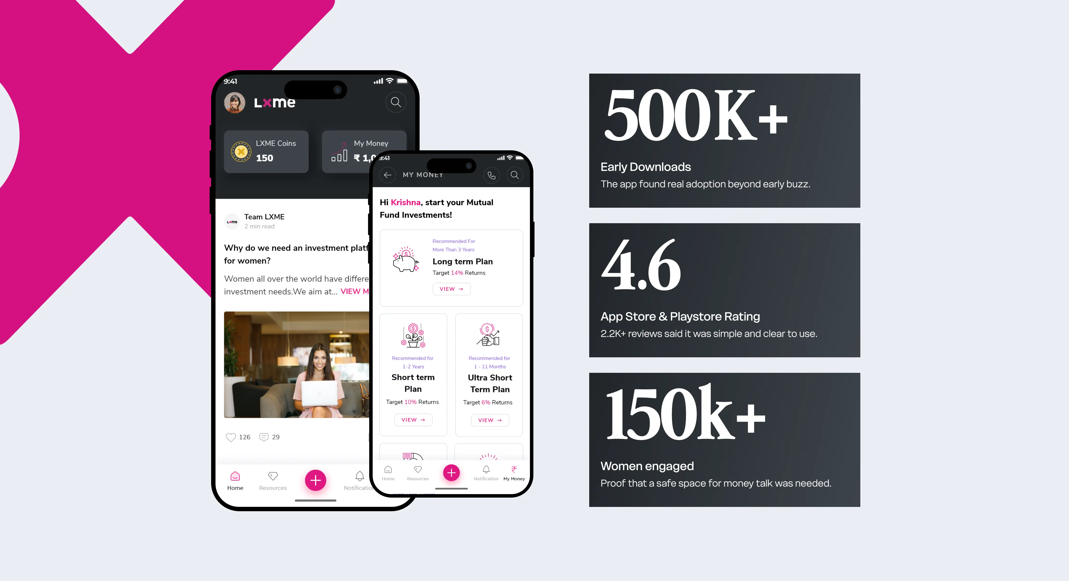 LXME launched with strong early traction, 500K+ downloads, 4.6★+ ratings across app stores, and an active community of women engaging in financial conversations. This indicated that users were willing to take their first towards investing.